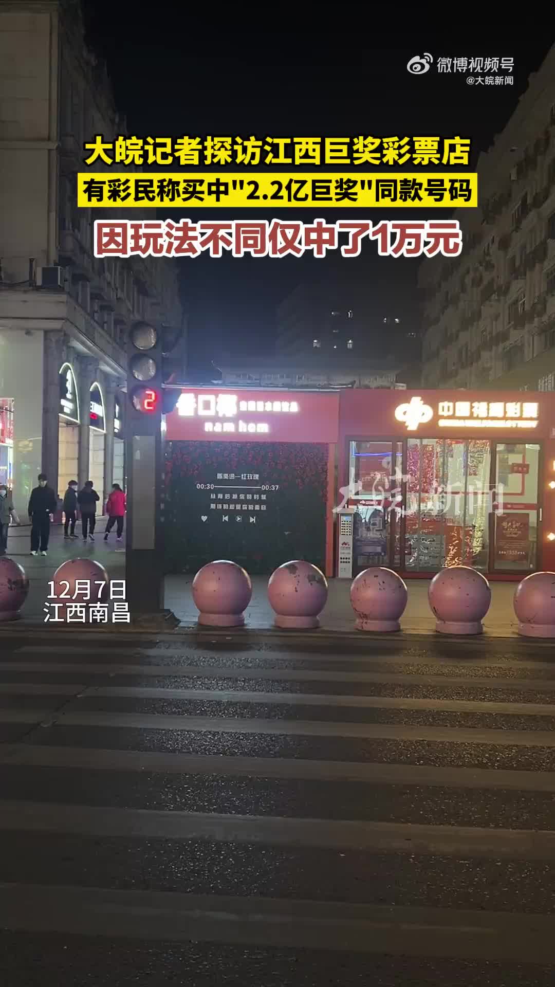 探访南昌开出2.2亿巨奖彩票店:有彩民买2.2亿巨奖同款号码只中1万元。彩民买10万元中奖2.2亿”的消息,这几天,一直挂在热搜上。而开出巨奖的彩票店,也随之火了。12月7日晚,记者来到南昌这家彩票店进行实探。有彩民告诉大皖新闻记者,店老板在群聊时,曾开玩笑表示过“后悔”,称“跟(下注)了我也是富豪了”。还有另一彩民,也买到了“同款”号码,但系快乐8之“选五复式”玩法,且只买了1倍,还“不幸”触发了限赔,因此,只中到1万元奖金。(via 大皖新闻)