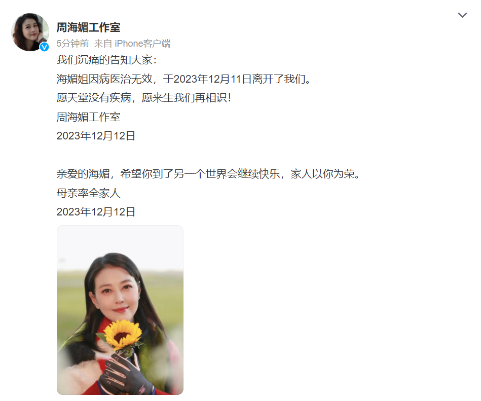 著名女演员周海媚去世,曾在《倚天屠龙记》中演周芷若。据上游新闻,12日晚间,从周海媚工作室获悉,著名演员周海媚因病医治无效去世。周海媚工作室发布消息,海媚姐因病医治无效,于2023年12月11日离开了我们。周海媚1966年出生,曾在《倚天屠龙记》中饰演周芷若、《武媚娘传奇》中饰演杨妃。