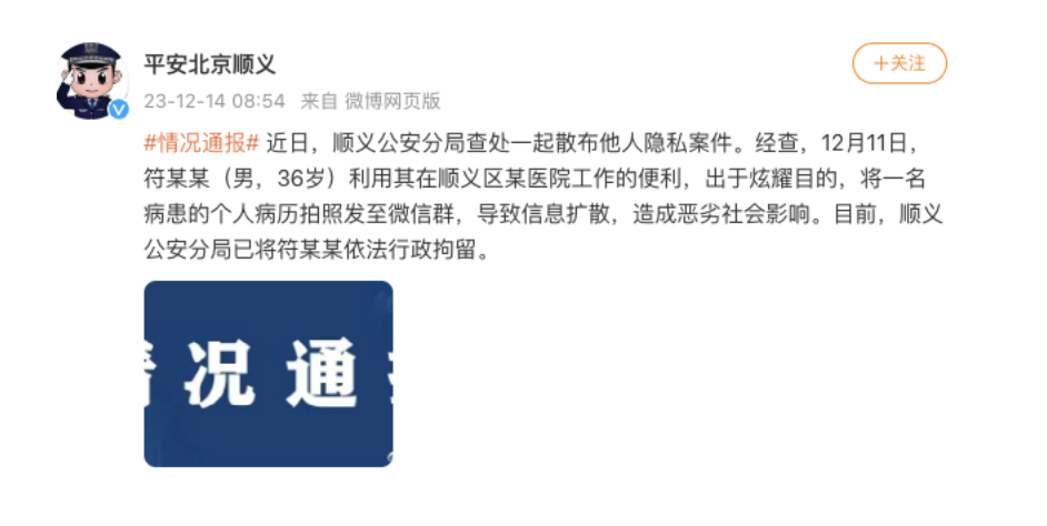 北京顺义警方:男子出于炫耀目的泄露病患个人病历,被行拘。北京顺义警方14日通报,近日,顺义公安分局查处一起散布他人隐私案件。经查,12月11日,符某某(男,36岁)利用其在顺义区某医院工作的便利,出于炫耀目的,将一名病患的个人病历拍照发至微信群,导致信息扩散,造成恶劣社会影响。目前,顺义公安分局已将符某某依法行政拘留。