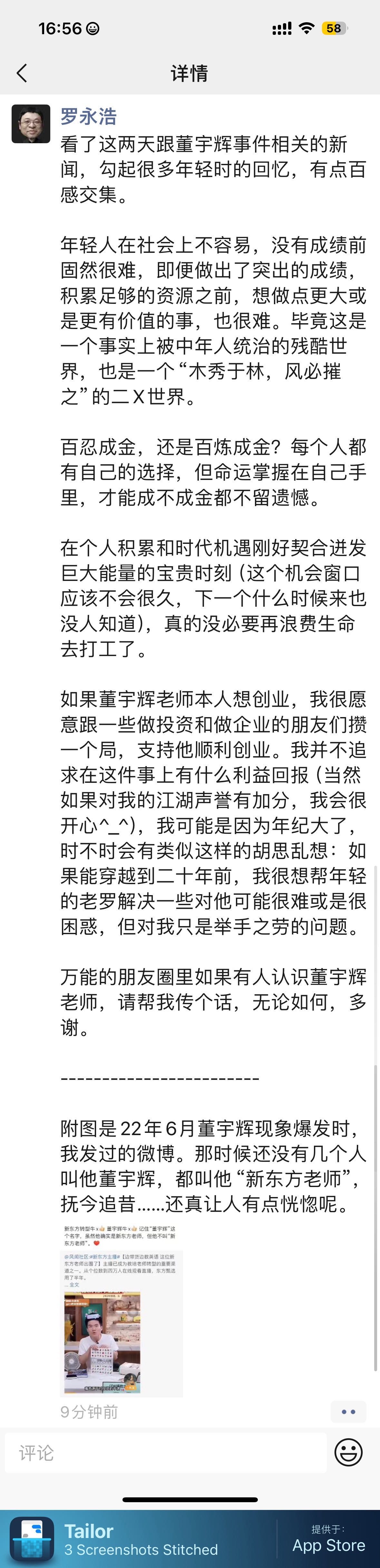 如果董宇辉老师本人想创业,我很愿意跟一些做投资和做企业的朋友们攒一个局,支持他顺利创业。我并不追求在这件事上有什么利益回报,我可能是因为年纪大了,时不时会有类似这样的胡思乱想:如果能穿越到二十年前,我很想帮年轻的老罗解决一些对他可能很难或是很困惑,但对我只是举手之劳的问题。