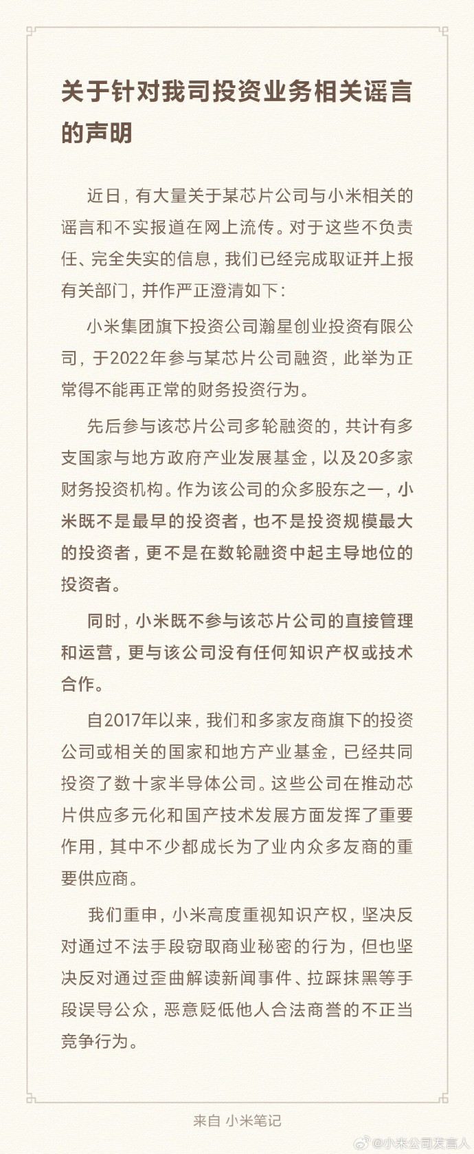 小米澄清大量关于与某芯片公司的传言。小米公司发言人微博12月24日发文指出,近日,有大量关于某芯片公司与小米相关的谣言和不实报道在网上流传。对于这些不负责任、完全失实的信息,小米已经完成取证并上报有关部门,并作严正澄清如下: