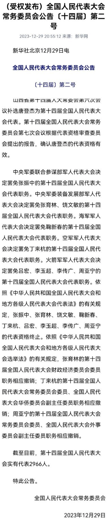 全国人民代表大会常务委员会公告〔十四届〕第二号。据新华社12月29日消息,山西省第十四届人大常委会第六次会议补选唐登杰为第十四届全国人民代表大会代表。第十四届全国人民代表大会常务委员会第七次会议根据代表资格审查委员会提出的报告,确认唐登杰的代表资格有效。依照《中华人民共和国全国人民代表大会和地方各级人民代表大会代表法》的有关规定,张振中、张育林、饶文敏、鞠新春、丁来杭、吕宏、李玉超、李传广、周亚宁的代表资格终止。