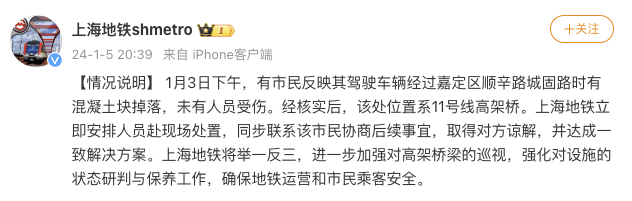 上海地铁通报“一高架桥混凝土块掉落”。1月5日,上海地铁通报,1月3日下午,有市民反映其驾驶车辆经过嘉定区顺辛路城固路时有混凝土块掉落,未有人员受伤。经核实后,该处位置系11号线高架桥。上海地铁立即安排人员赴现场处置,同步联系该市民协商后续事宜,取得对方谅解,并达成一致解决方案。上海地铁将举一反三,进一步加强对高架桥梁的巡视,强化对设施的状态研判与保养工作,确保地铁运营和市民乘客安全。