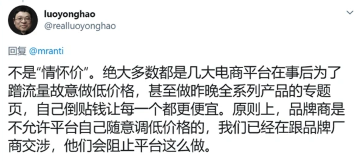 罗永浩回应带货不是“全网最低”:个别平台为蹭流量故意做低价格。针对网友吐槽自己直播带货中价格不是“全网最低价”,罗永浩本人在推特表示绝大多数都是几大电商平台在事后为了蹭流量故意做低价格,甚至做4月1日全系列产品的专题页,自己倒贴钱让每一个都便宜,原则上品牌商不允许平台自己随意调低价格,他们已经在跟品牌厂商交涉。4月1日罗永浩抖音直播累计观看人数超过4800万人,总交易额超1.1亿元。