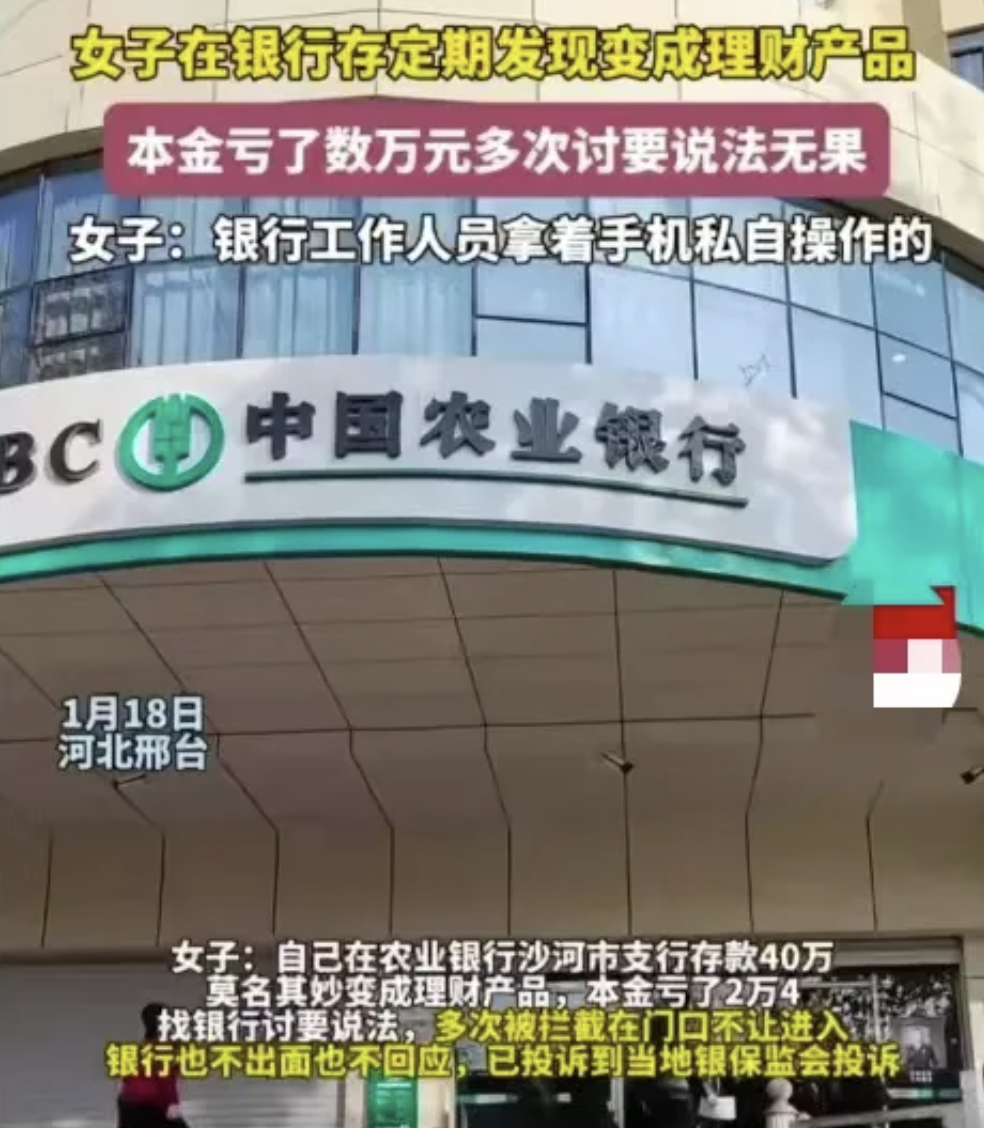 据长江云新闻,1月19日,网上一则女子银行“定期存款”变“理财产品”亏损2万4成为热搜新闻。视频中显示,女子在农业银行沙河市支行存入40万元定期存款,却发现被银行工作人员私自操作变成了理财产品,导致本金亏损了2万4千元。该女子多次向银行讨要说法,却遭到了银行的拦截和拒绝回应。