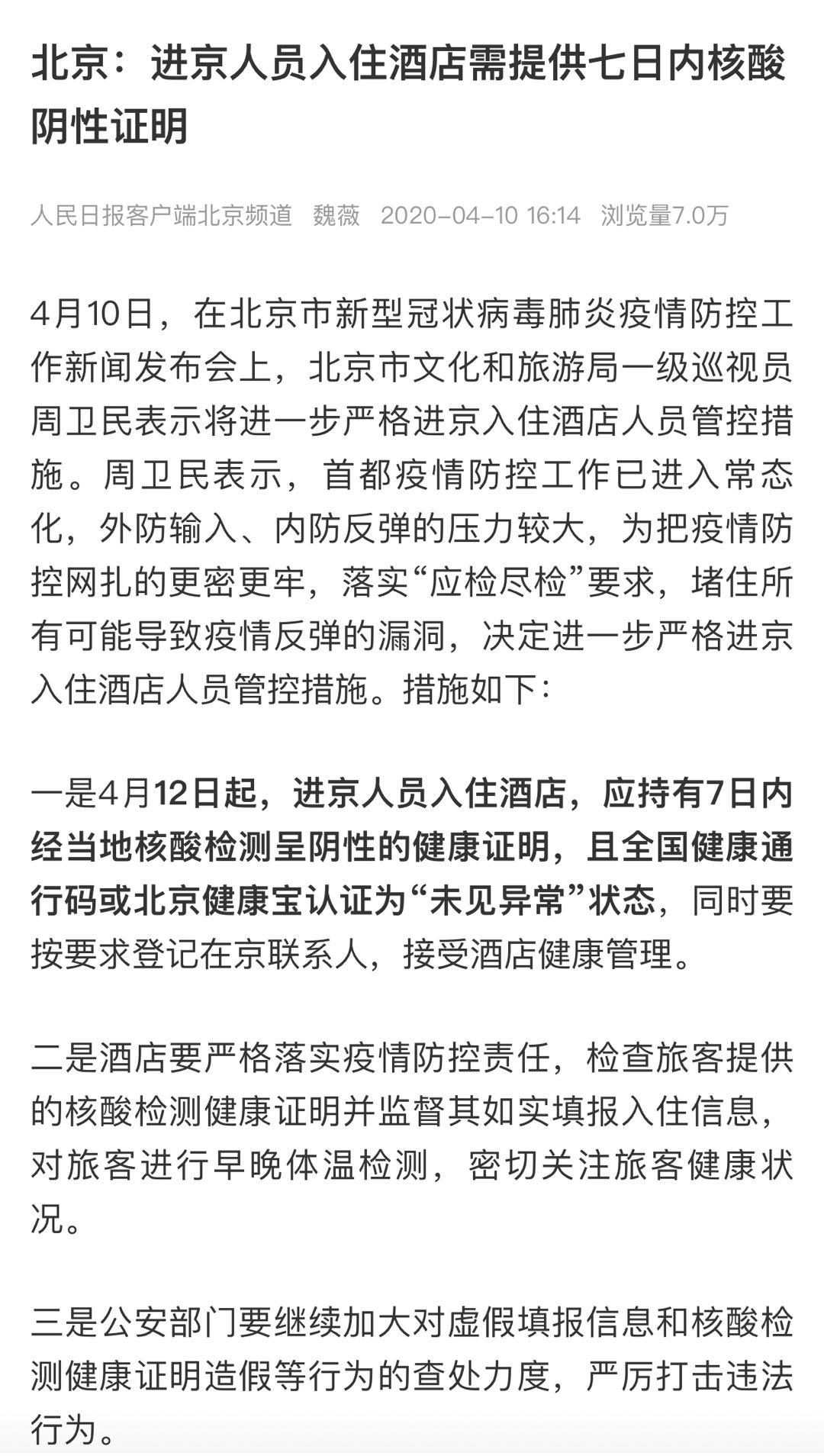 北京:进京人员入住酒店需提供七日内核酸阴性证明。4月10日,在北京市新型冠状病毒肺炎疫情防控工作新闻发布会上,北京市文化与旅游局一级巡视员周卫民表示将进一步严格进京入住酒店人员管控措施。4月12日起,进京人员入住酒店,应持有7日内经当地核酸检测呈阴性的健康证明,且全国健康通行码或北京健康宝认证为“未见异常”状态,同时要按要求登记在京联系人,接受酒店健康管理。