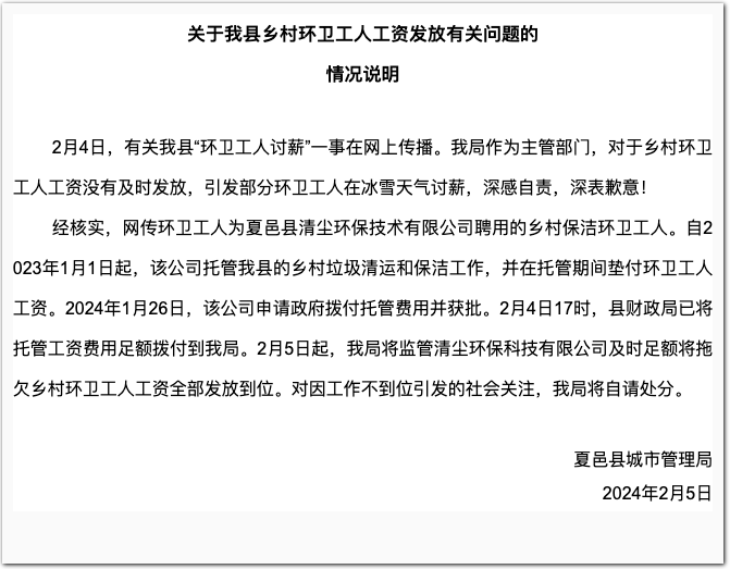 经核实,网传环卫工人为夏邑县清尘环保技术有限公司聘用的乡村保洁环卫工人。自2023年1月1日起,该公司托管夏邑县的乡村垃圾清运和保洁工作,并在托管期间垫付环卫工人工资。2024年1月26日,该公司申请政府拨付托管费用并获批。2月4日17时,县财政局已将托管工资费用足额拨付到城市管理局。2月5日起,城市管理局将监管清尘环保科技有限公司及时足额将拖欠乡村环卫工人工资全部发放到位。对因工作不到位引发的社会关注,城市管理局将自请处分。