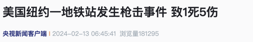 据央视新闻援引美国广播公司(ABC)援引知情人士报道,当地时间2月12日,美国纽约市布朗克斯区一个地铁站发生枪击事件,造成1人死亡、5人受伤。