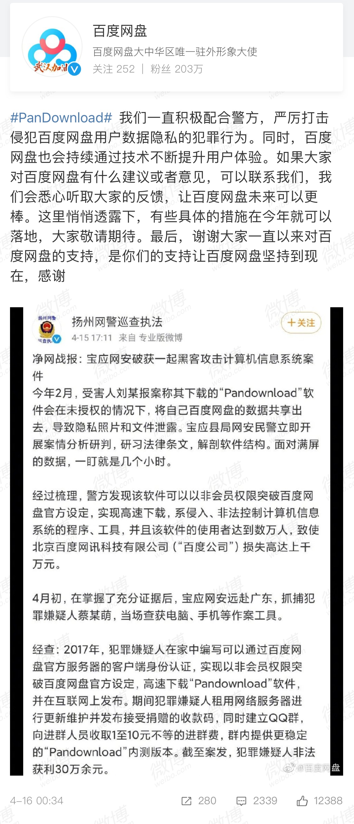 百度网盘破解版Pandownload开发者被抓,百度回应。据扬州网警巡查执法官方消息,百度网盘破解版Pandownload开发者已被抓,同时百度网盘官方于今日凌晨对此事做出了回应。百度网盘方面表示,官方一直积极配合警方,严厉打击侵犯百度网盘用户数据隐私的犯罪行为。同时,百度网盘也会持续通过技术不断提升用户体验。
