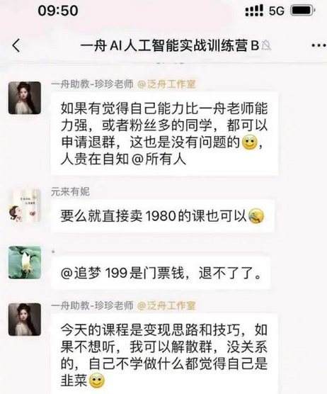 但在靠课程吸金的同时,不少网友表示,常常遇到购买后无人售后、单节课程时长过短(通常为10到20分钟)、广告过多等问题。对课程内容的不满引发了越来越多的人选择退课。有消息称,李一舟的一个AI实战训练营群,昨日疑似被助教解散,原因是有学员质疑已购买课程在给其他高价课程打广告。该群助教则作出了“如果不想听,我可以解散群”等强硬回应。界面新闻就助教一事询问李一舟时,他并未明确表态是否会处理这名助教。