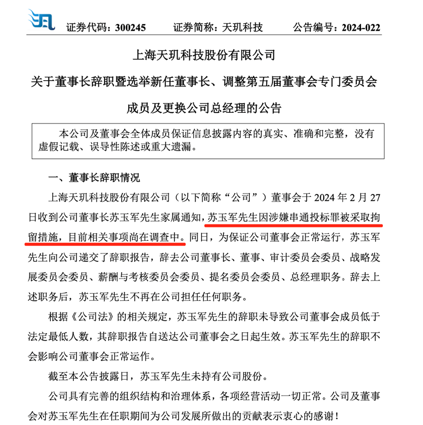 天玑科技公告提到,公司董事会于2024年2月27日收到董事长苏玉军家属通知,苏玉军因涉嫌串通投标罪被采取拘留措施。