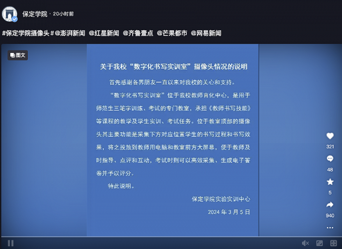 保定学院通报“教室布满摄像头”:便于教师及时指导、点评和互动。