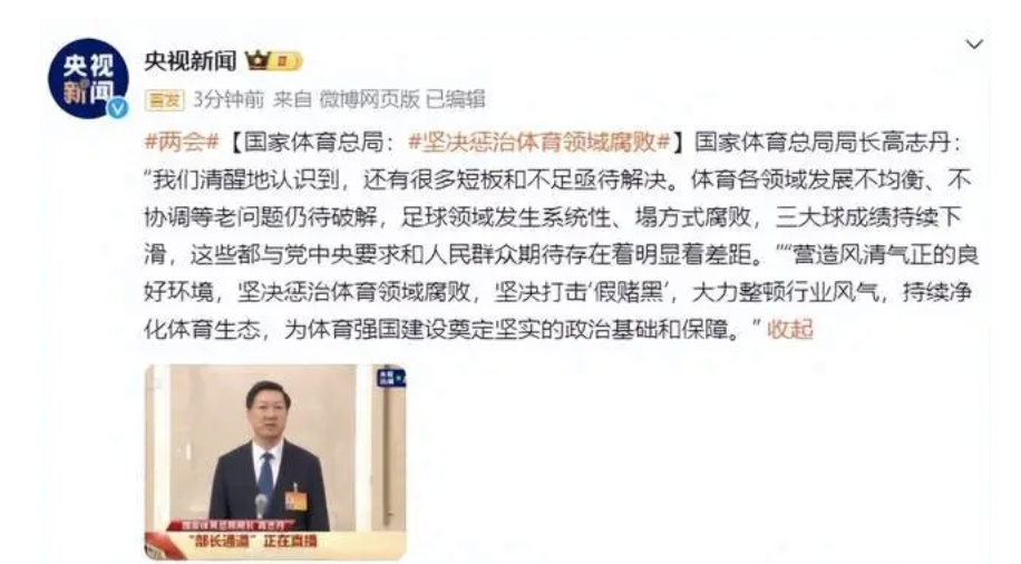 国家体育总局局长高志丹:“我们清醒地认识到,还有很多短板和不足亟待解决。体育各领域发展不均衡、不协调等老问题仍待破解,足球领域发生系统性、塌方式腐败,三大球成绩持续下滑,这些都与党中央要求和人民群众期待存在着明显着差距。”“营造风清气正的良好环境,坚决惩治体育领域腐败,坚决打击‘假赌黑’,大力整顿行业风气,持续净化体育生态,为体育强国建设奠定坚实的政治基础和保障。”