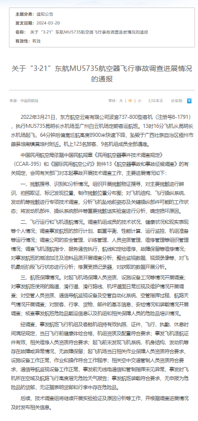 民航局通报“3·21”东航MU5735航空器飞行事故调查进展情况。