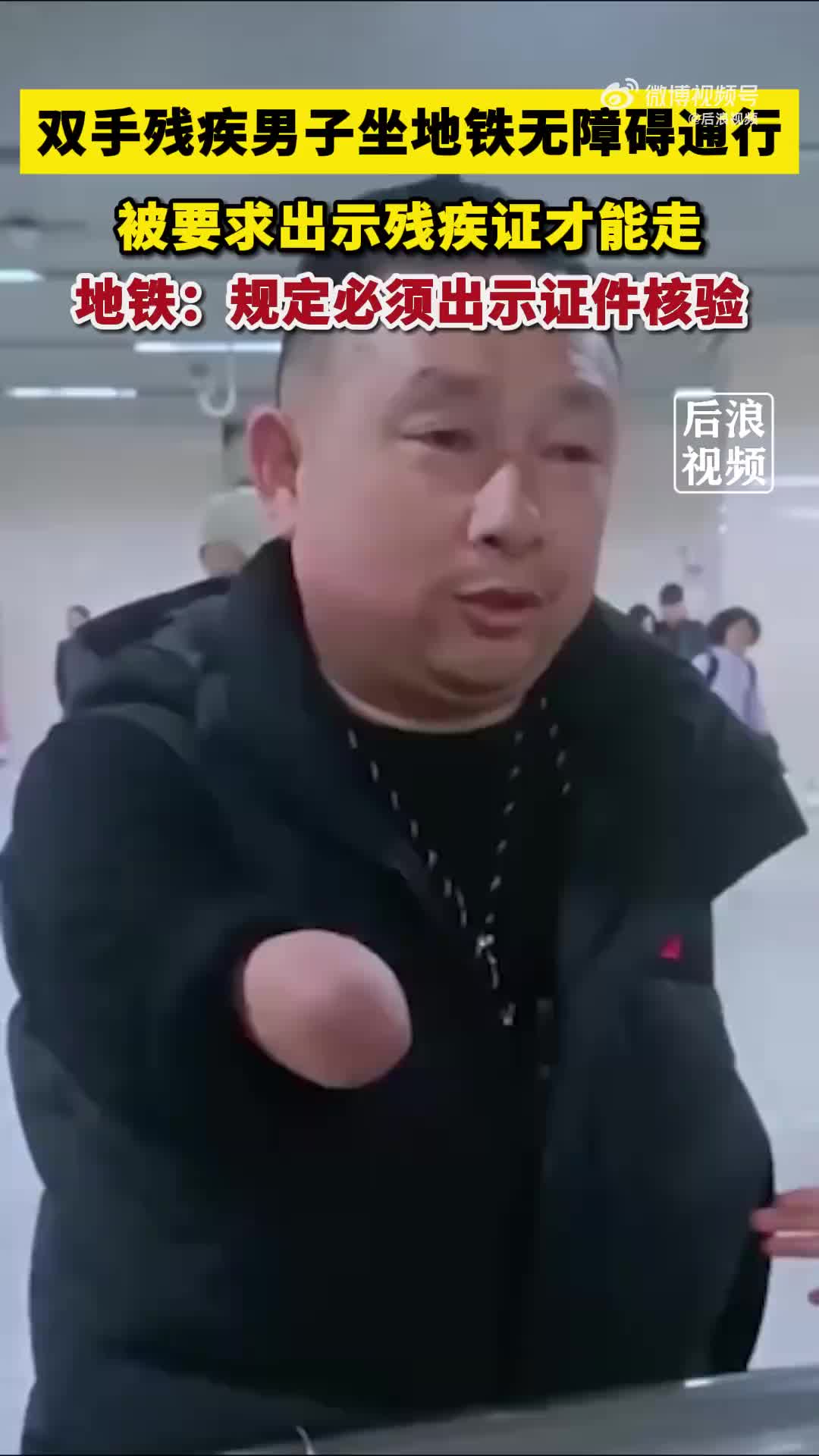 无臂男子免费乘地铁被要求出示残疾证,地铁:规定必须出示证件核验。3月21日,李先生乘坐地铁体验无障碍通行,在明显双手残疾的情况下仍被要求出示残疾证才能享受无障碍通行。李先生称,工作人员非要出示残疾证才能证明是残疾人,有些残疾人本身就不便携带和出示证件,感觉很不人性化。对此,地铁客服表示, 现有的规定是必须出示相关证件核验后才能享无障碍通行,会反馈到相应执管部门进一步考虑可行性。(via 后浪视频)