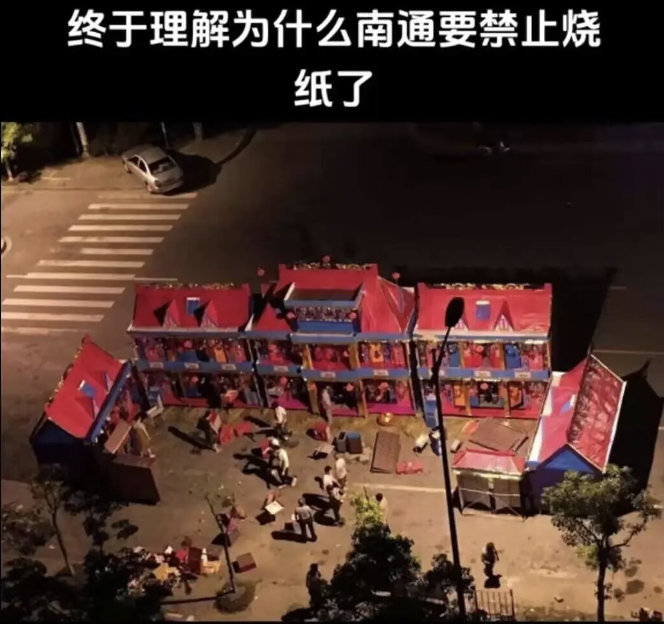 3月29日,一段网传视频曝出,南通祭祀烧纸现场,纸扎用品有两层楼高,并配文:“终于理解南通为什么要禁止烧纸了”。