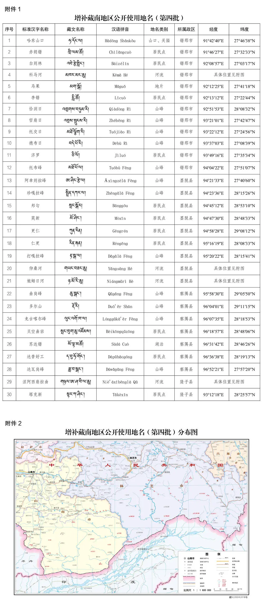 民政部发布增补藏南地区公开使用地名(第四批)的公告。据中新网3月30日消息,民政部发布关于增补藏南地区公开使用地名(第四批)的公告。根据国务院地名管理的有关规定,我部会同有关部门对我国藏南地区部分地名进行了标准化处理。现正式公布第四批增补藏南地区公开使用地名(共30个)。