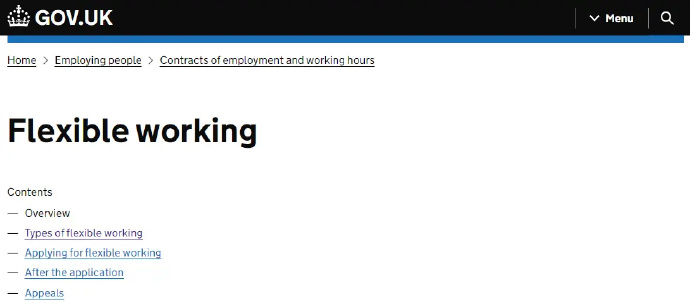 目前所有员工都被允许要求弹性工作制的合法权利,员工可向雇主提出的合法申请包括工作时间、开始和结束工作的时间、特定的工作时间和工作的地点 。