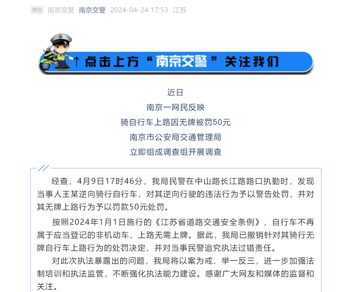 据南京交警微信公号,近日,南京一网民反映骑自行车上路因无牌被罚50元,南京市公安局交通管理局立即组成调查组开展调查。
