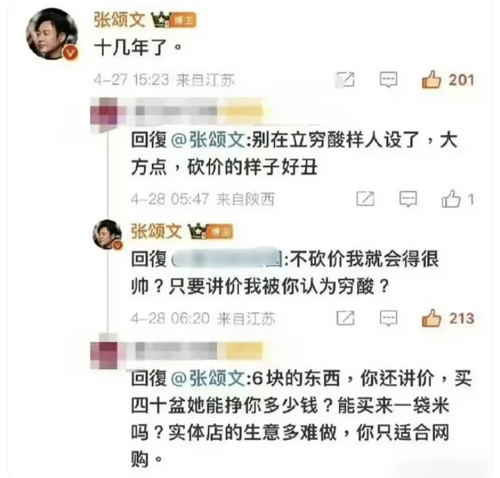 张颂文被吐槽“立穷酸人设”,本人回应。近日,知名演员张颂文在某真人秀节目中展现了他熟练砍价的技巧。在节目中购置新植物时,张颂文和卖花阿姨探讨植物如何种植,随后在镜头面前毫不掩饰地熟练砍价:“能不能再少点,我再买多一点”。几番砍价后,卖花阿姨都忍不住表示:“你咋这么抠门呢。”张颂文则笑着回应,“我真的是很抠的。”有网友吐槽张颂文:“别再立穷酸样人设了,大方点,砍价的样子好丑。”面对这样的批评,张颂文于4月28日通过评论回应,表达了自己的看法:“不砍价我就会很帅?只要讲价我就被认为穷酸?”