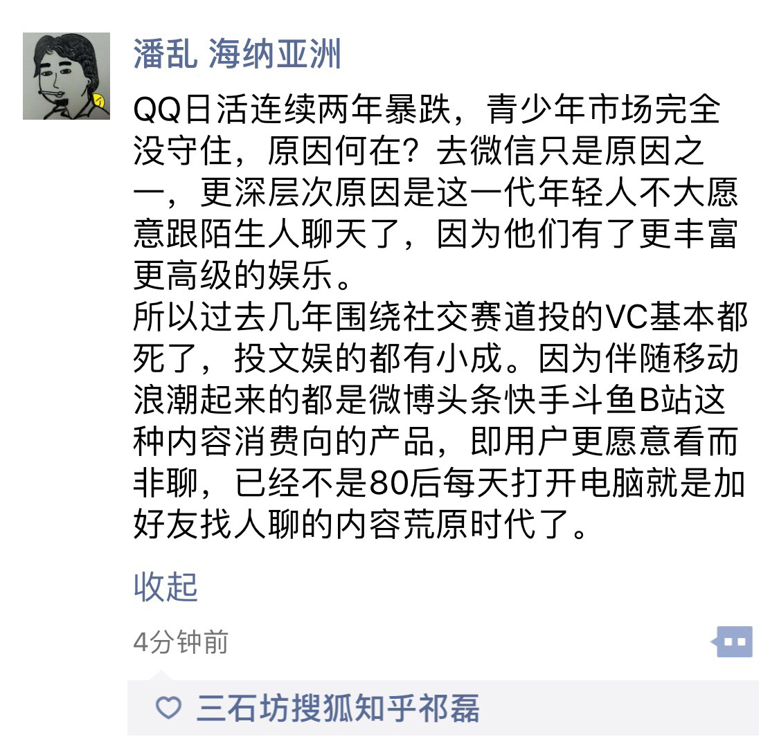 看了潘乱前辈的观点,我正好分享自己在sns lab上对陌生社交的最新观点:1、纯社交的时代已经过去,做一个单纯的陌生社交平台在今天已经不再现实,社交的边界变得模糊、和娱乐内容等融合,社交元素成为标配无处不在。2、陌生社交的娱乐属性正在放大,并超过实用属性,社交娱乐化是一个明显的趋势,狼人杀只是一个开始。3、从以上角度分析,陌生社交的对手是王者荣耀是吃鸡,比的是单位时间多巴胺心流的娱乐效率。