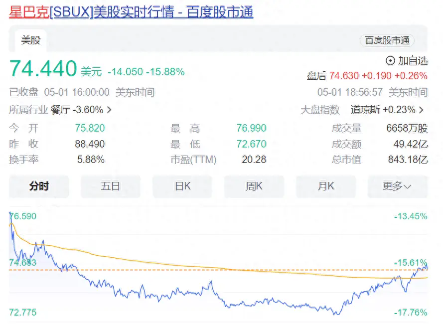 据每经综合,当地时间5月1日,星巴克股价闪崩,一度跌近18%,截至收盘,星巴克跌15.88%,股价报收74.44美元,总市值843.18亿美元,市值一夜蒸发了159.15亿美元(约合人民币1150亿元)。