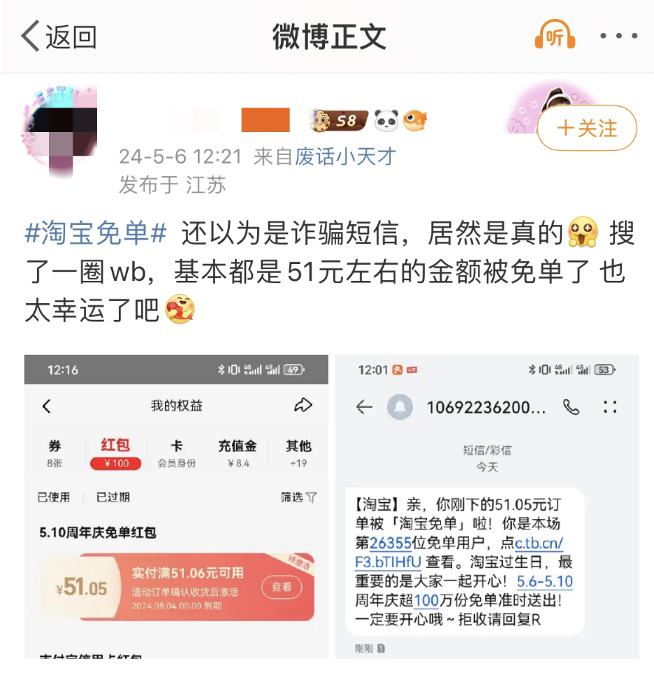 大批量用户突遭免单,淘宝账户凭空多出51块钱,到底是不是BUG?