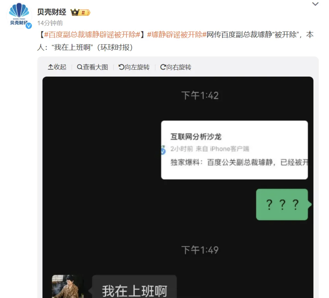 百度副总裁璩静辟谣被开除。据澎湃新闻,5月8日,有传言称百度副总裁璩静已被百度开除。对此,《环球时报》耿直哥栏目就该传闻咨询璩静本人,璩静回应称,“我在上班啊”。澎湃新闻记者也就此事询问百度方面,一位百度内部人士回复称:“我刚还看见她上班了呢。”5月7日,璩静已清空了抖音号上的全部视频。