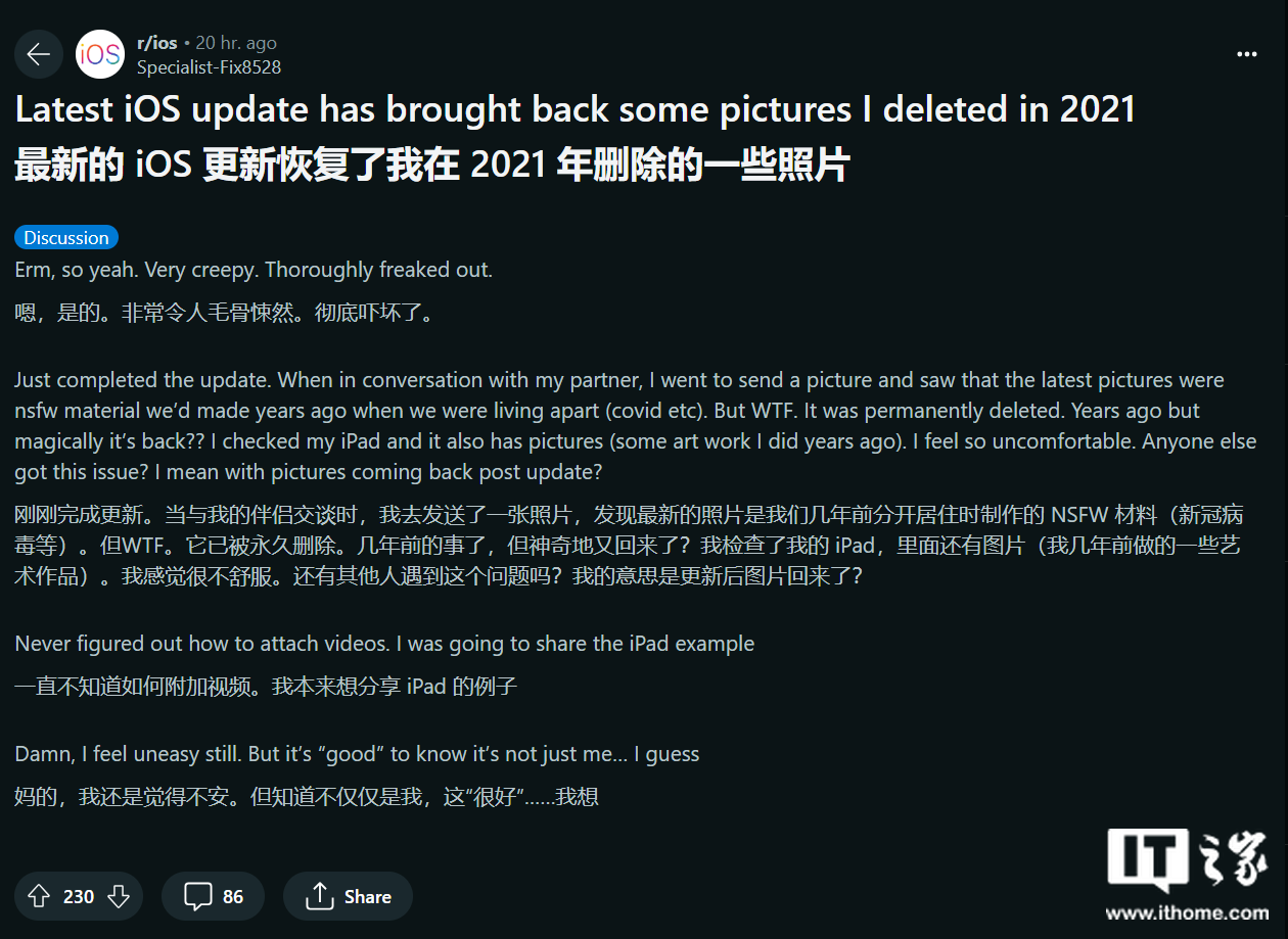 这些用户表示,在更新到iOS 17.5后,他们发现照片应用内的最新照片竟是几年前就已经被永久删除的私密内容。一位用户心有余悸地描述道:“我正和伴侣聊天,想发张照片,却发现最新的照片竟然是我们几年前异地恋时拍摄的私密照,明明这些照片早在数年前就已被永久删除,现在却莫名其妙地回来了!我检查了一下iPad,也出现了同样的问题(一些我几年前创作的艺术作品)。这让我感到非常不安。”