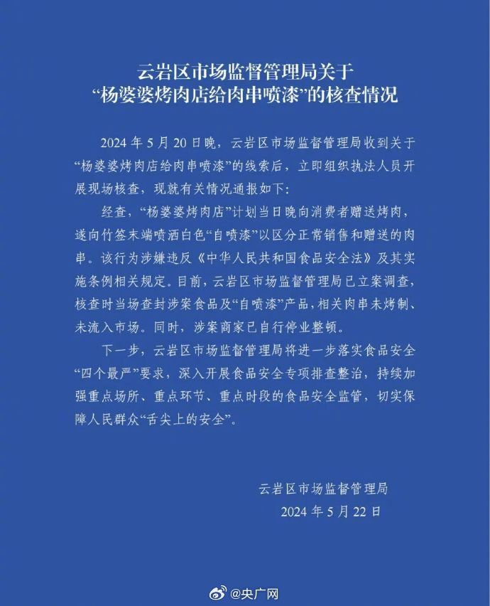 贵州一烤肉店给肉串喷漆?官方通报:为区分正常销售和赠送的肉串,涉案商家已停业整顿。5月22日,贵阳市云岩区市场监管局官方微信公众号发布关于“杨婆婆烤肉店给肉串喷漆”的核查情况。经查,“杨婆婆烤肉店”计划当日晚向消费者赠送烤肉,遂向竹签末端喷酒白色“自喷漆”以区分正常销售和赠送的肉串。该行为涉嫌违反《中华人民共和国食品安全法》及其实施条例相关规定。目前,云岩区市场监督管理局已立案调查,核查时当场查封涉案食品及“自喷漆”产品,相关肉串末烤制、未流入市场。同时,涉案商家已自行停业整顿。
