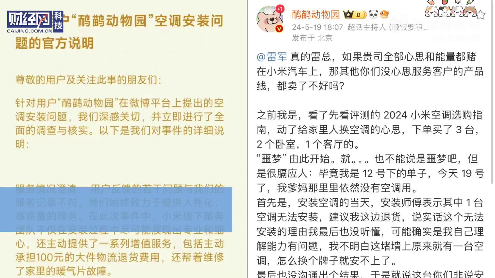 近日博主“鸸鹋动物园”发布动态称,5月12日为父母下单购买3台小米空调,但直到19日仍没有空调用。博主表示,安装空调的当天,安装师傅表示其中1台空调无法安装,建议退货便离开了。后续找客服沟通过程中,该博主再次下单买了1台空调,希望能有安装师傅上门安装,结果直到19日,客厅里放着4台空调,8个大箱子,没人给安,也没人给退。