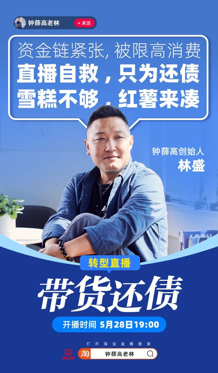 据每日经济新闻,5月27日,钟薛高创始人林盛开设淘宝直播账号,将通过直播带货的形式还债。5月28日晚,林盛正式开播。开播前他表示目前拖欠729位员工薪资,直播赚钱后将逐步还钱给员工,背景板写着“钟薛高老林直播卖红薯”与数字“729”。
