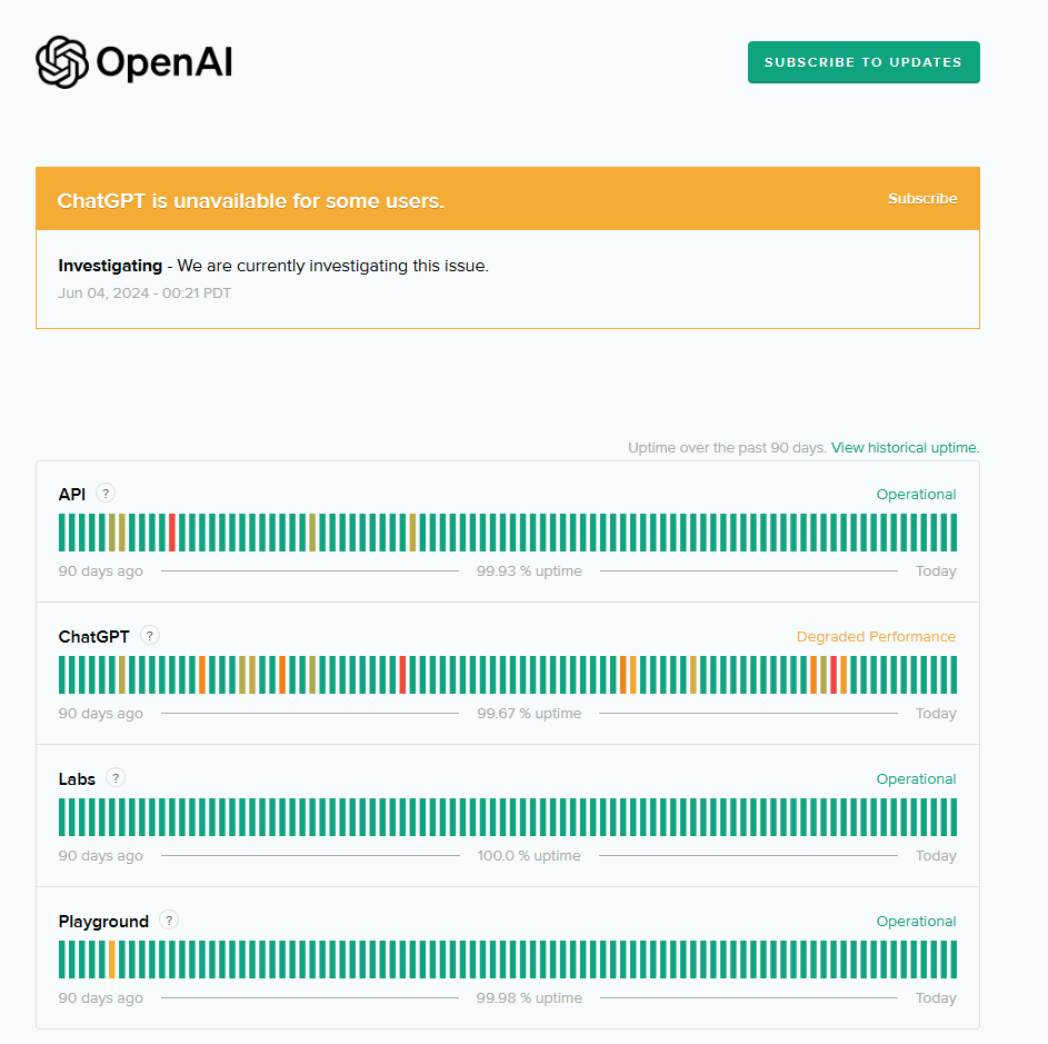 ChatGPT崩了,OpenAI回应称正在调查。据IT之家,大约15:20分左右,大量用户反馈称ChatGPT服务宕机。截至IT之家发稿,OpenAI状态仍显示为“不可用”,OpenAI称开发人员正在对该问题进行调查。