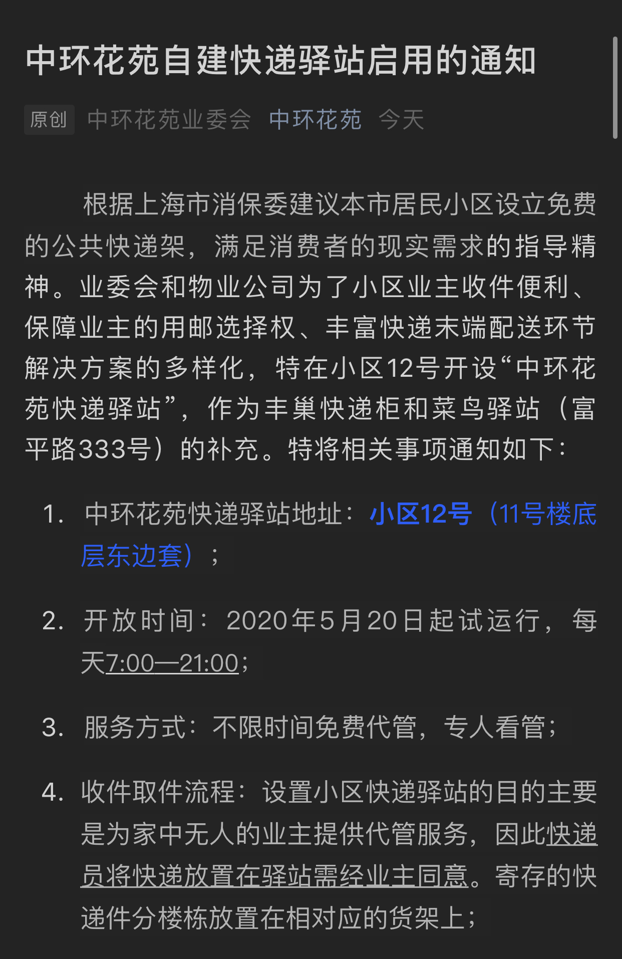 上海首个停用丰巢小区自建快递架:不限时间免费代管,5月20日起试运行。今日,上海中环花苑小区通过其公众号发布了“自建快递驿站启用的通知”。通知称,根据上海市消保委建议本市居民小区设立免费的公共快递架,业委会和物业公司为了小区业主收件便利、保障业主的用邮选择权、丰富快递末端配送环节解决方案的多样化,特开设“中环花苑快递驿站”,作为丰巢快递柜和菜鸟驿站的补充。开放时间为:5月20日起试运行,每天7:00-21:00不限时间免费代管,专人看管。