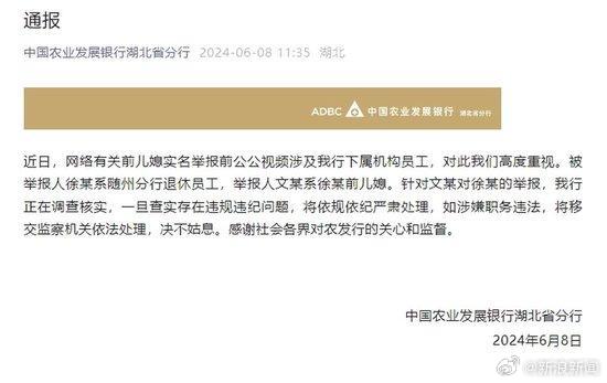 农发行通报前儿媳举报公公有巨额不明财产。8日,中国农业发展银行湖北省分行发布通报,称近日,网络有关前儿媳实名举报前公公视频涉及我行下属机构员工,对此我们高度重视。被举报人徐某系随州分行退休员工,举报人文某系徐某前儿媳。针对文某对徐某的举报,我行正在调查核实,一旦查实存在违规违纪问题,将依规依纪严肃处理,如涉嫌职务违法,将移交监察机关依法处理,决不姑息。感谢社会各界对农发行的关心和监督。