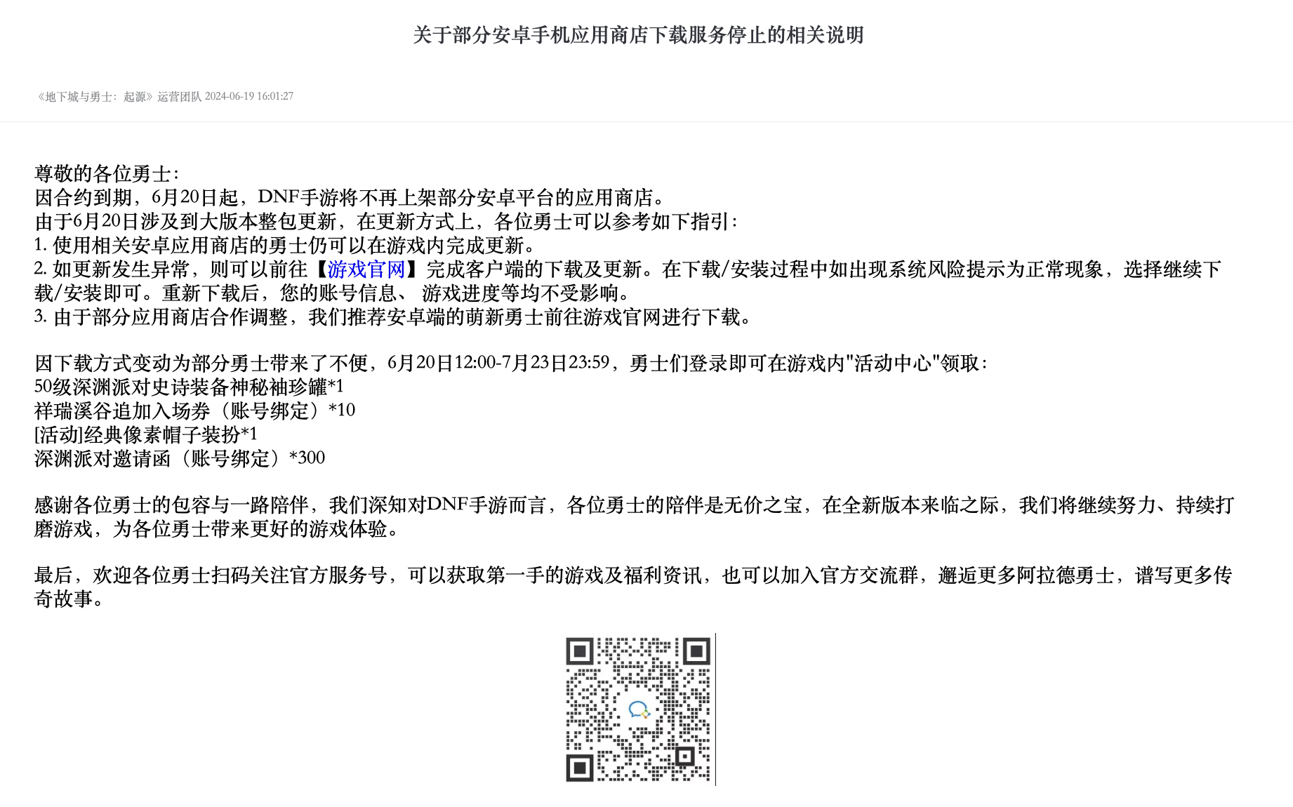《DNF》手游运营团队方面并未在公告中提及更多下架原因,只表示,“由于部分应用商店合作调整,我们推荐安卓端的萌新勇士前往游戏官网进行下载。”