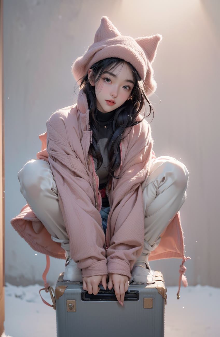 南方小土豆:她们身穿浅色羽绒服+头戴可爱帽子+坐上行李箱脚却够不着地。